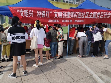 5月23日上午,德清县武康镇舞阳社区回龙花园小区内人头攒动、人声鼎沸,德清农商银行联合德清县税务局组织开展了“税银红 文明兴” 全国文明城市创建知识进社区主题党日活动,这是在我县创建办指导下,两家党建联盟单位组织党员于每周六上午进社区开展党员活动,通过2个半月的宣传,有效提高了广大市民对文明创建的知晓率、满意率。现场小区居民兴致勃勃参加有奖问答,扫描二维码关注我县文明创建公众号,党员向居民分发宣传资料,对垃圾分类、交通安全、公勺公筷使用、《小区实地测评细则》等进行详细讲解和宣传普及,并分发小礼品。
