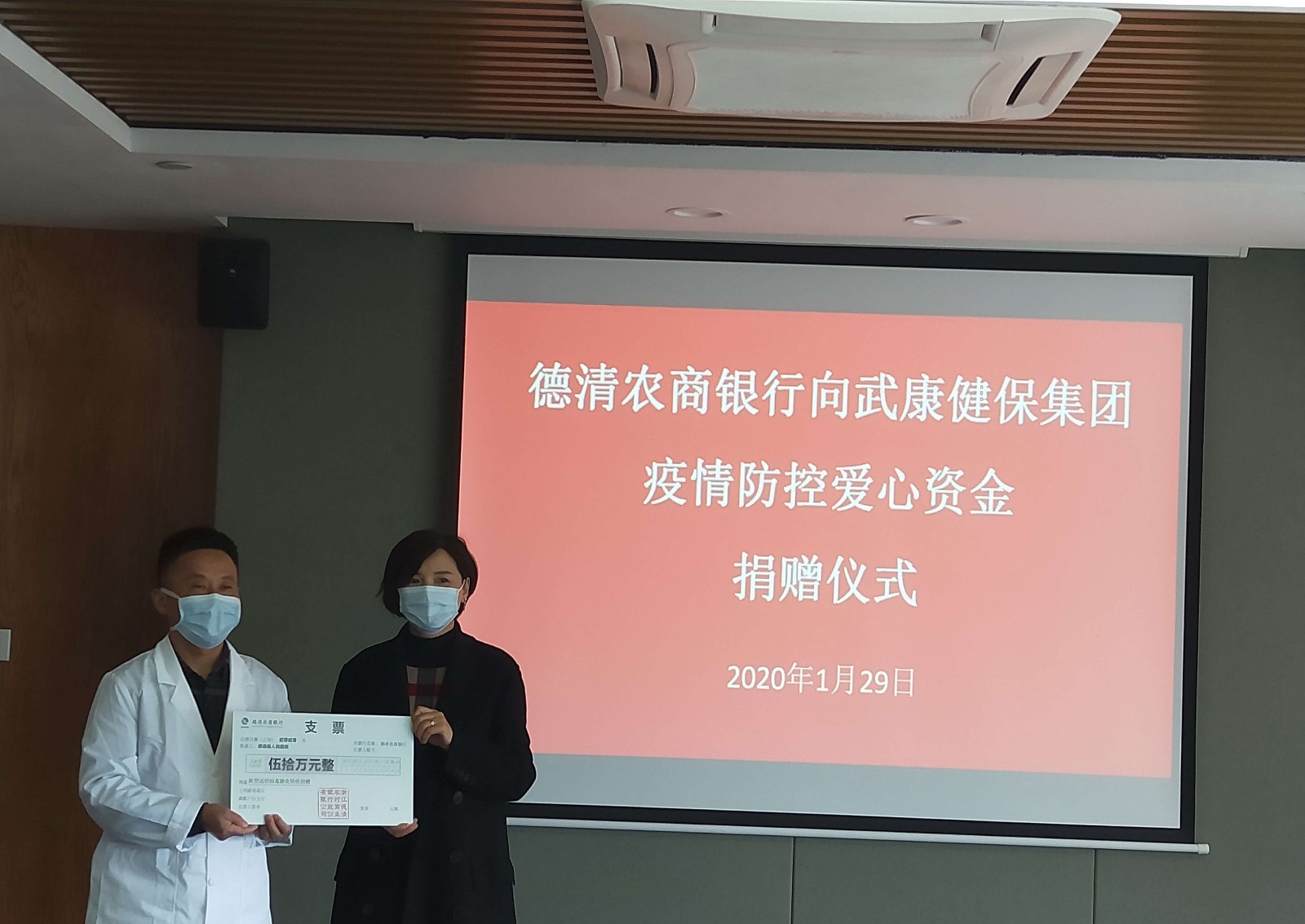 1月29日上午,德清农商银行通过县慈善总会,定向向德清县健保集团捐赠50万元,该笔资金专项用于医院采购疫情防控所需物资和设备,及奖励一线医护人员(含支援武汉医疗队),全力抗击新型冠状病毒感染的肺炎疫情,为打赢这场疫情阻击战贡献一份力量。